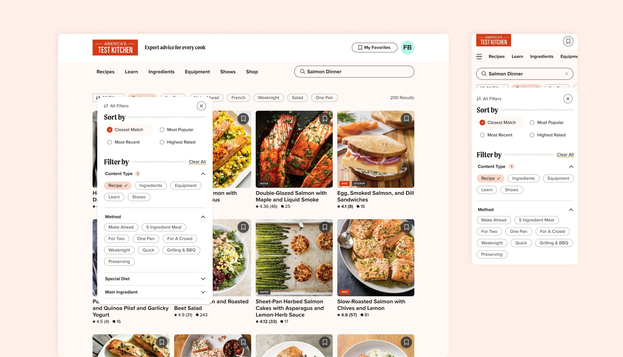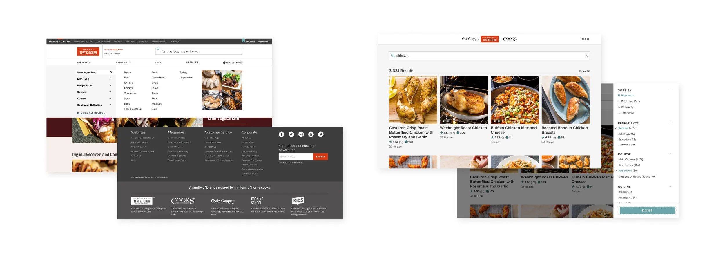 This is partly due to ATK's long legacy of multiple brand websites, varying menus, and brand-centered search tags. These elements inadvertently emphasized large projects rather than showing that ATK caters to a wide range of diverse constraints. As the company transitioned to a single site approach, they wanted to focus on customer-centered navigation, helping people find recipes that meet their needs quickly.